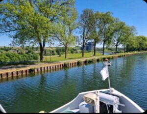 C’est au fil de l’eau, en naviguant sur une péniche, que nous avons découvert la nécessité de construire des canaux, les différents types d’écluses, les chemins de halage et les différentes méthodes: humaine, animale, mécanique. Un franc soleil de printemps et le ciel bleu embellissaient Dame Nature, le chant des oiseaux nous accompagnait. Moment privilégié de douceur paisible et de joyeuse amitié.