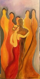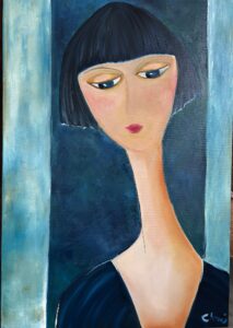 J’aime particulièrement peindre des femmes et selon mes états d’âme elles sont virevoltantes, colorées ou plus nostalgiques. J’espère ainsi rendre hommage à toutes celles qui ont joué un rôle primordial dans ma vie et qui m’ont façonnée.